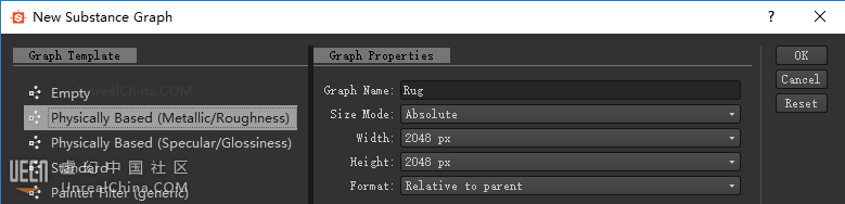 2. 贴图制作: 不会Substance Designer或者没有此软件的小伙伴可以在结尾处找到贴图下载链接。 打开Substance Designer(此处使用5.5.3),新建项目选择UE4对应的PBR材质管线,输入项目名称选择尺寸模式及长宽点击OK。