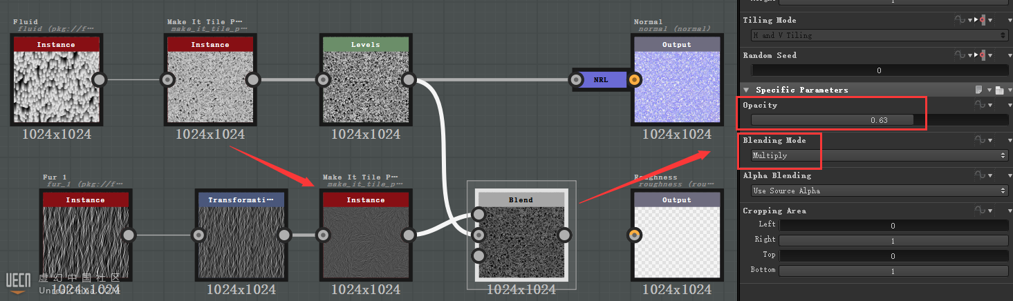 用同样参数的Make it tile patch grayscale 降低重复度并使其具有随机多样性,然后用Blend节点的Multiply模式混合粗毛底图和细毛。