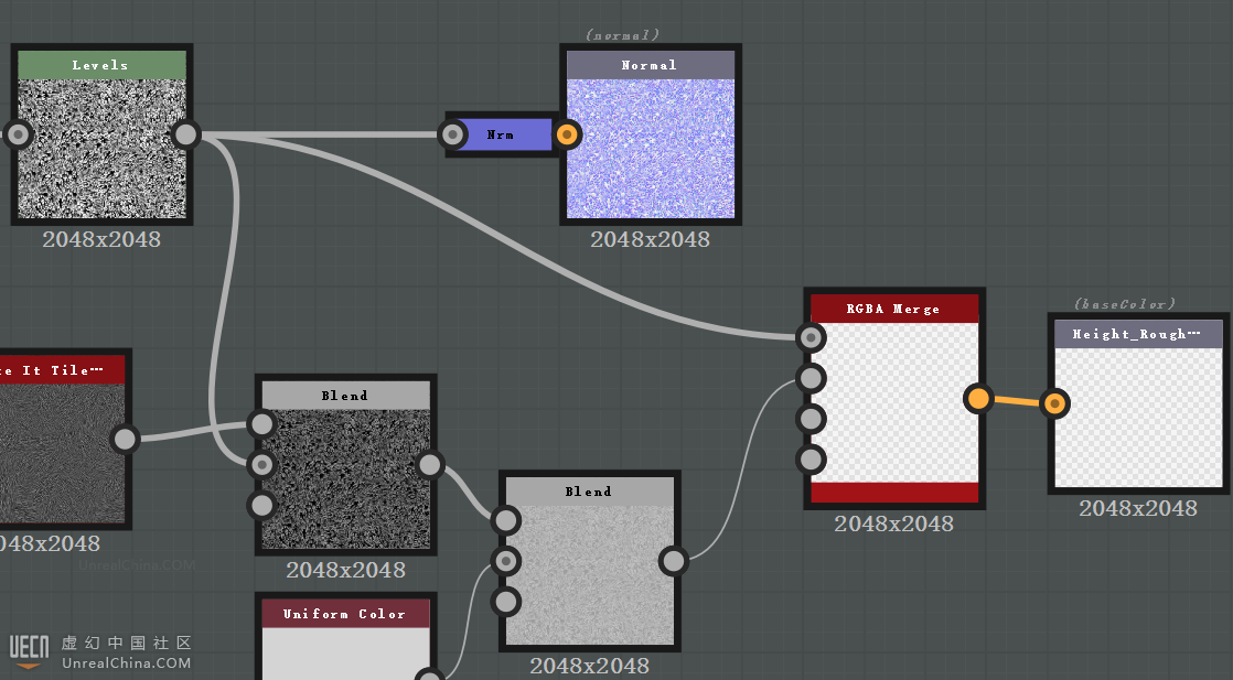 为了降低UE4材质的性能开销,相比于调用多个Texture Sampler,将多个图分别合并到一张图的RGBA通道是个不错的办法,所以这里将高度图和粗糙度图使用RGBA Merge合并到最后输出的贴图的R和G通道。