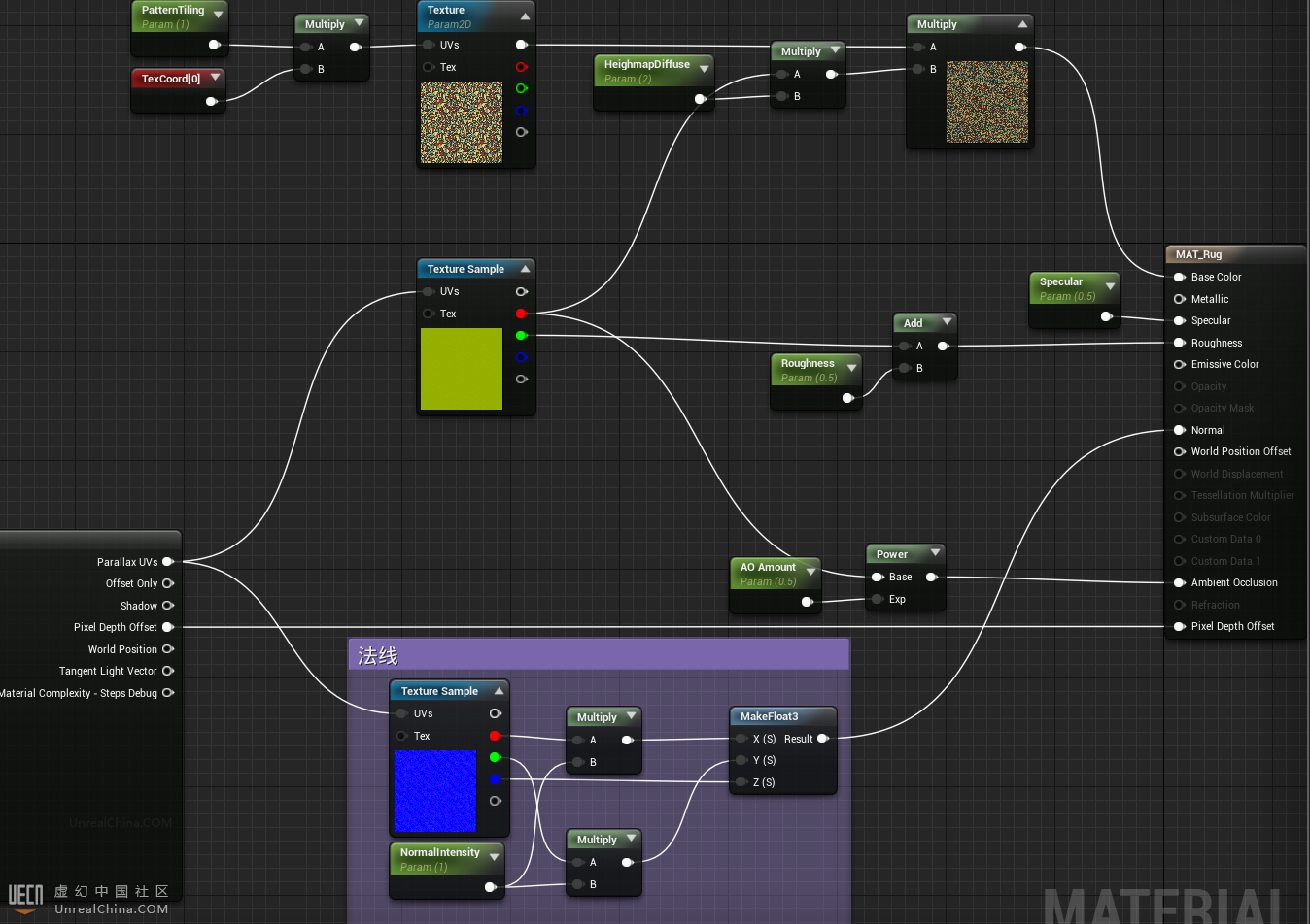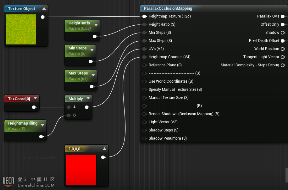 但是视差贴图不是完美的,一般在地面和墙面的应用效果好一些,这种时候观察角度趋于垂直于表面,不易暴露问题。关于视差贴图的原理可以点击此链接 对于美术人员,可能不需要了解太多深层次的原理,所以回到UE4根据每个引脚的不同提示连接参数即可。 Heightmap Texture连接高度图,并且类型为Texture Object,但是我们的高度图在改贴图的R通道,所以再Heightmap Channel引脚处可以连接一个 1,0,0,0 来单独提取出R通道。 Height Ratio高度系数可以理解为偏移的高度。Min Steps是垂直表面观看时偏移的步数,Max是侧面看的偏移步数。步数越高越不容易暴露问题和瑕疵,但是过高也会增加开销。根据视觉需要来调整参数。UVs大家都知道了。其实我不是专业研究材质的,估计瞎写了这么多要被@Yupsilon嘲讽了,哈哈哈。