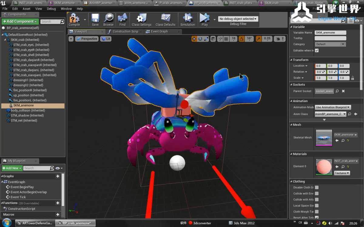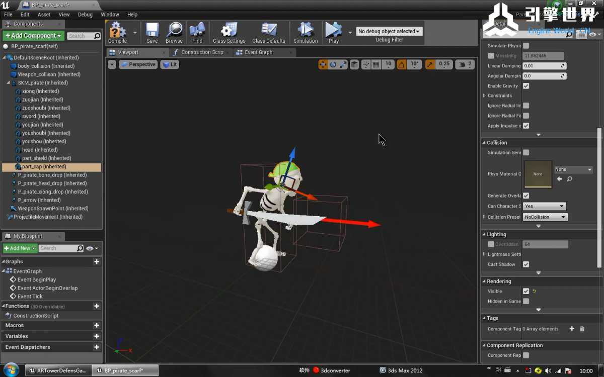 下面进入到海盗的制作环节,由于海盗的种类也有很多,所以海盗的制作思路与螃蟹的制作思路保持一致。即制作一个附蓝图类,然后用这个父蓝图扩展出多个子蓝图类。而在父蓝图类当中需要导入所有的模型材质素材以及创建好海盗所有的行为机制蓝图节点。而海盗的模型也是采用分开导入的方法,我在模型软件当中创建了一个只有腿部的带骨骼模型,而海盗的身躯,头部,手臂都是静态网格模型,随后在蓝图中进行组装。