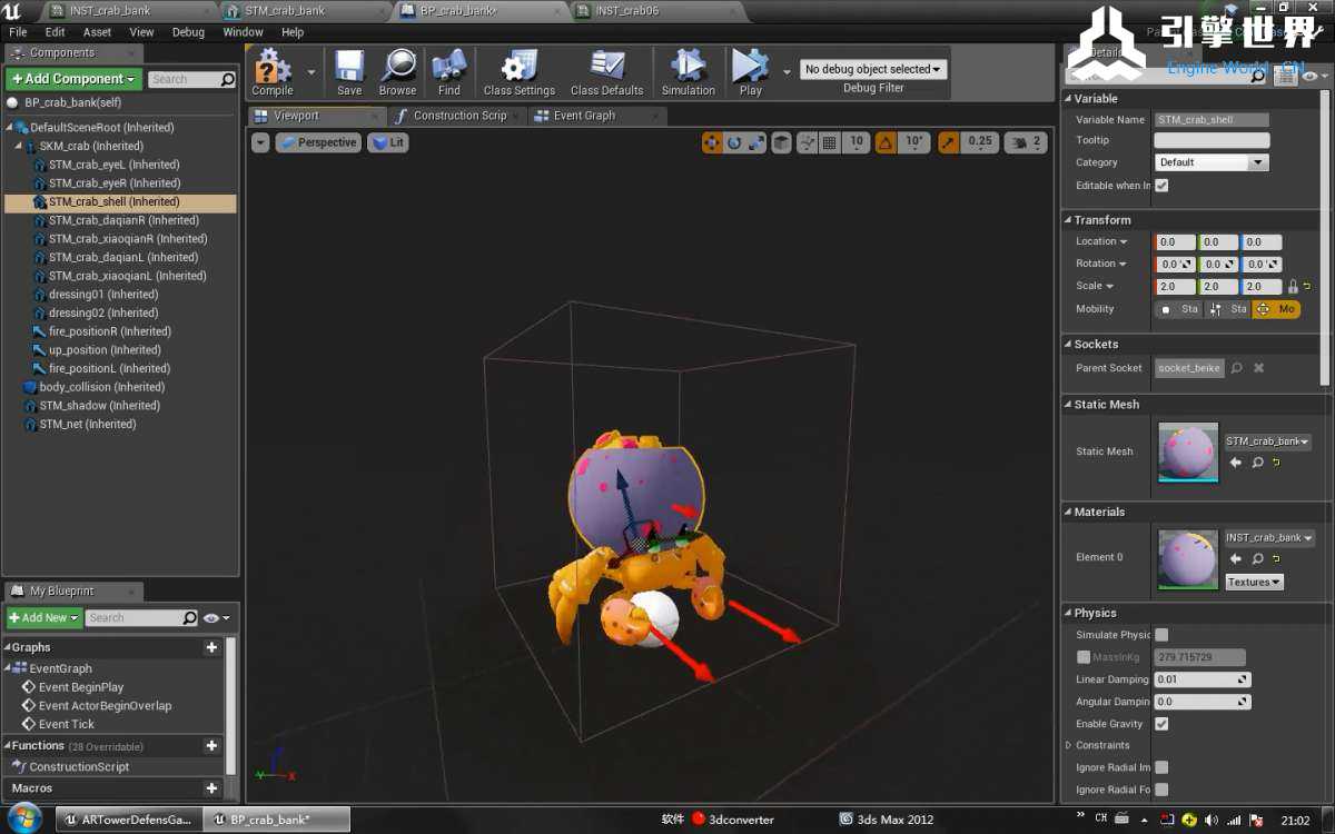 下面是金钱螃蟹,这是一个只会产生金钱,不会攻击的螃蟹。玩家捡拾这些金币可以用以购买更多的螃蟹,金币通过不同的物体碰撞通道进行区分。当玩家捡拾金币的时候就进行通道检测。随后在gameinstance中创建一个整数变量,用来存储当前玩家的金钱数,我设定了一个值,每次捡拾金币的时候就+30金钱。