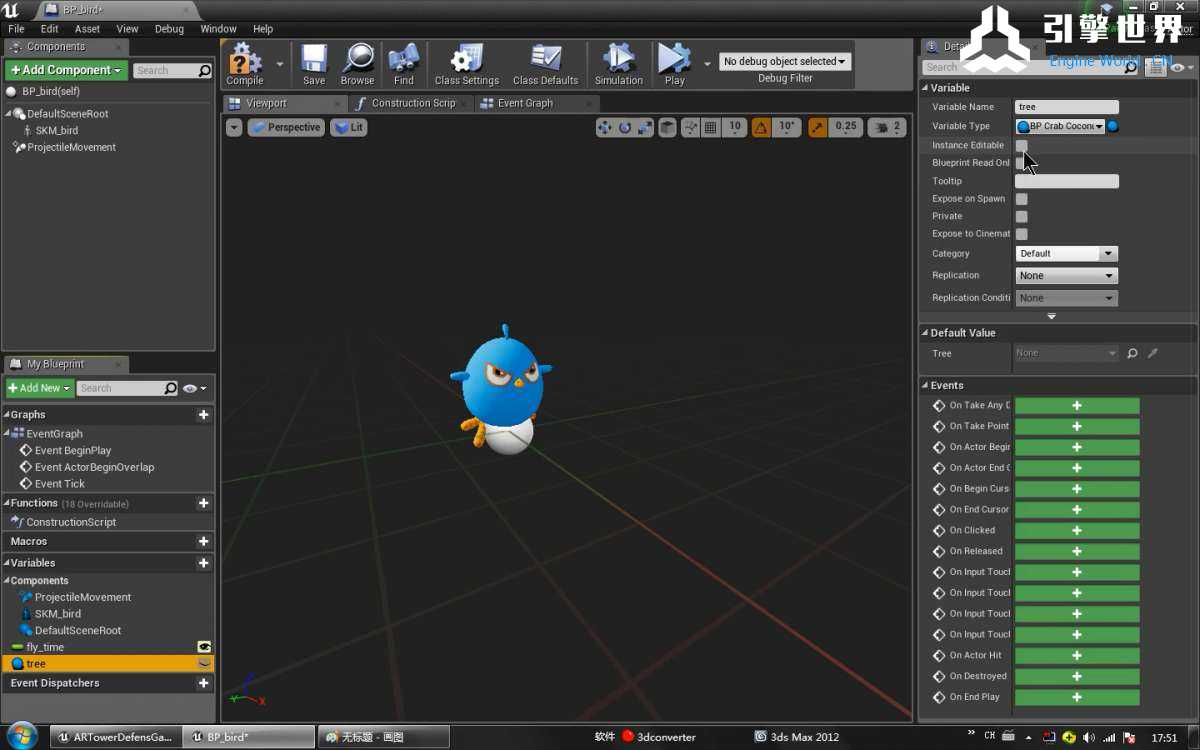 下面这个武器是椰子树,椰子树这个武器不同于螃蟹武器。他是一个长在海边的椰子树,树上住着一只小鸟,这只小鸟对于入侵她领地的敌人会展开自卫攻击。她会飞到敌人的上方,用鸟蛋来轰炸敌人,被轰炸到的敌人会受到AOE伤害并拥有减速效果。由于这个武器虽然放在螃蟹武器当中,但是拥有完全不同于螃蟹武器的攻击方式,所以他的制作方法也不一样。我的制作思路是将原有模板中的螃蟹武器隐藏,随后导入椰子树与小鸟的模型。当螃蟹武器开始攻击时,获取场景内的敌人,并将敌人的变量存储在蓝图中,随后生成一个飞行轰炸用的小鸟,将敌人的位置信息告诉给这个小鸟,小鸟根据这个位置,计算出要轰炸的时间点,同时完成轰炸攻击。